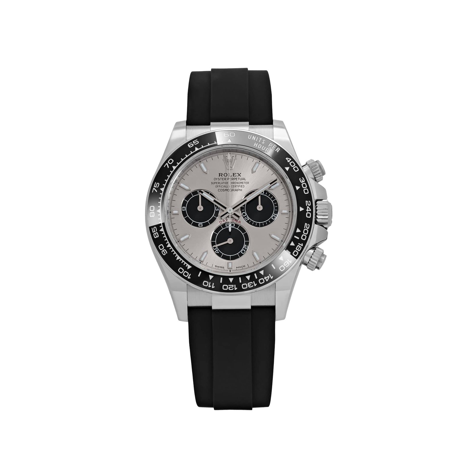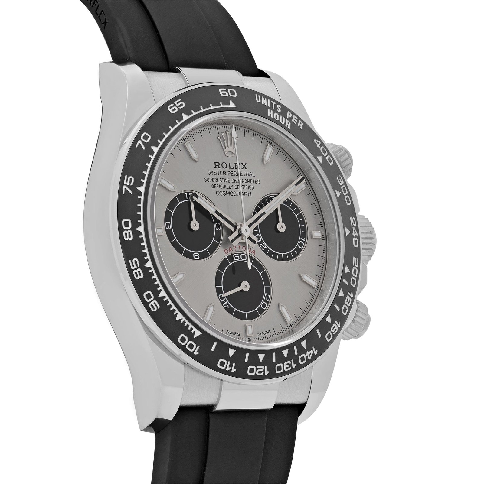 The watch is paired with a black Oysterflex bracelet—Rolex’s innovative elastomer strap reinforced with flexible metal blades—offering a sporty yet luxurious feel on the wrist. The Oysterlock safety clasp ensures secure wear, while the Easylink extension system provides quick micro-adjustments for perfect comfort.