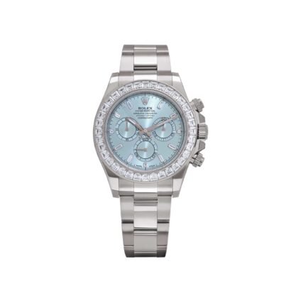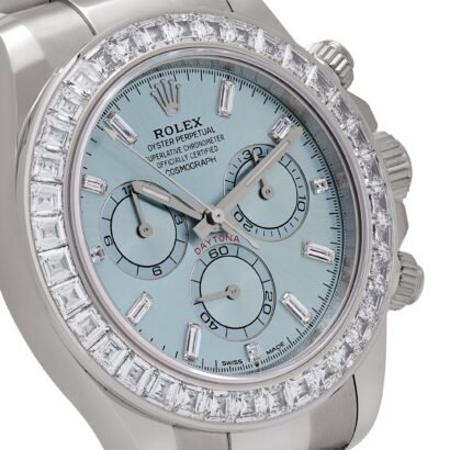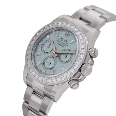 The Rolex Daytona 126576TBR stands as the pinnacle of Rolex’s platinum chronograph collection. This exceptional timepiece, crafted entirely from platinum, transforms the classic Daytona design with a factory-set diamond bezel and a striking ice blue sunburst dial—a hue exclusively reserved for Rolex’s platinum models. The addition of baguette diamond hour markers further enhances its brilliance, elevating an already outstanding watch into a true symbol of ultra-luxury.