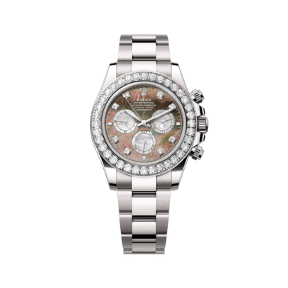 The dial is rendered in lustrous mother of pearl, accented by diamond hour markers and contrasting white gold subdials, offering both opulence and legibility. The watch is completed by an Oyster bracelet with polished center links for added sophistication. Ideal for collectors who want a Daytona with both technical prowess and gemstone brilliance, the 126579RBR balances subtle elegance with Rolex’s