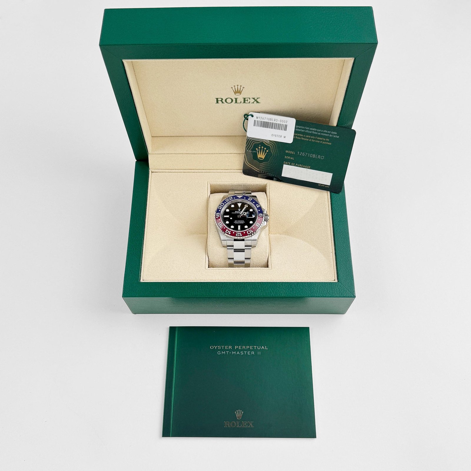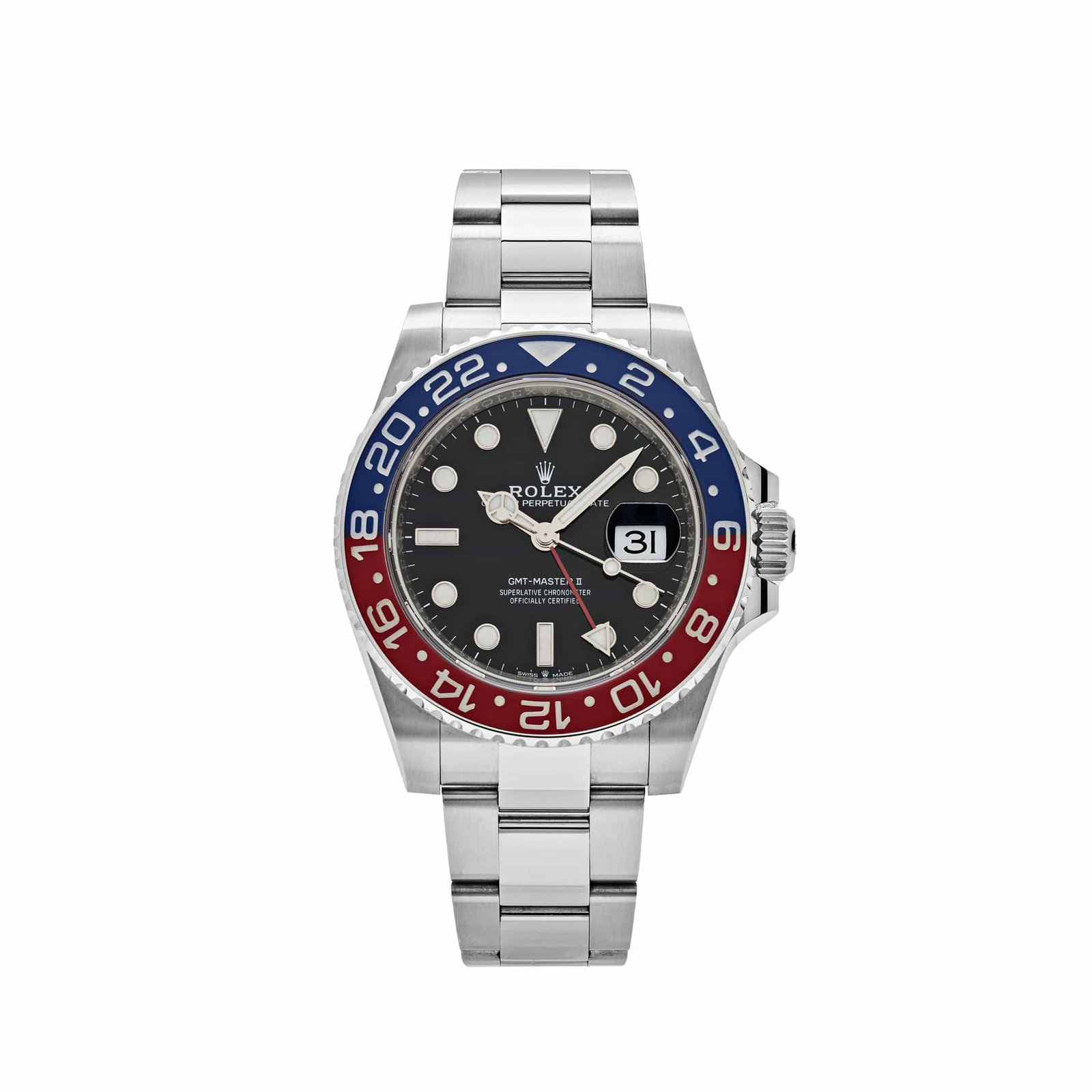 At the heart of this GMT-Master II is the Caliber 3285, a self-winding movement equipped with Rolex’s Chronergy escapement, offering improved efficiency, magnetic resistance, and a 70-hour power reserve. Certified as a Superlative Chronometer, this movement guarantees unparalleled precision with an accuracy of -2/+2 seconds per day, meeting the rigorous standards of modern travelers.