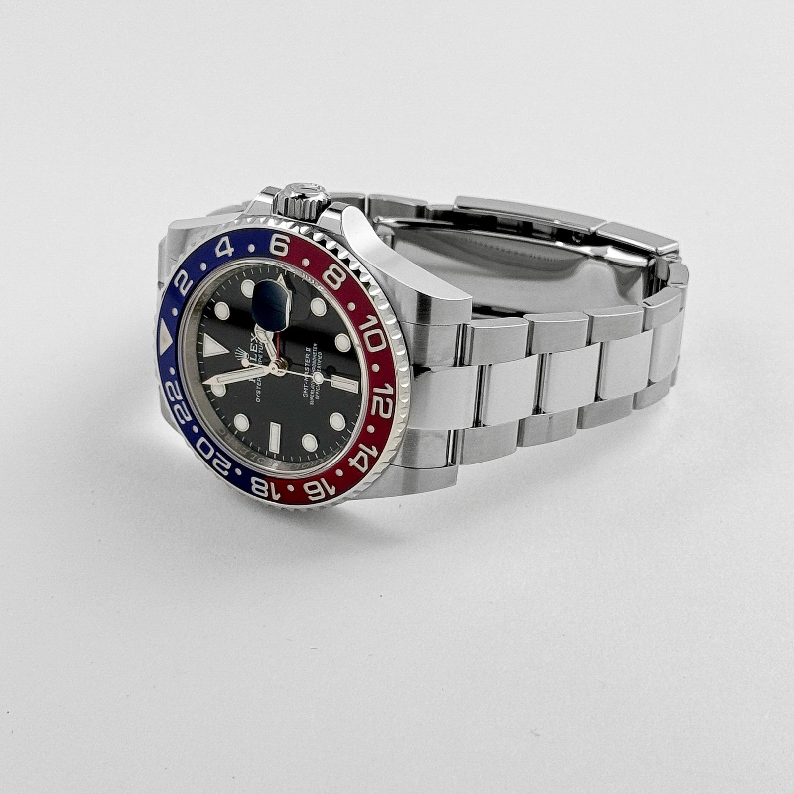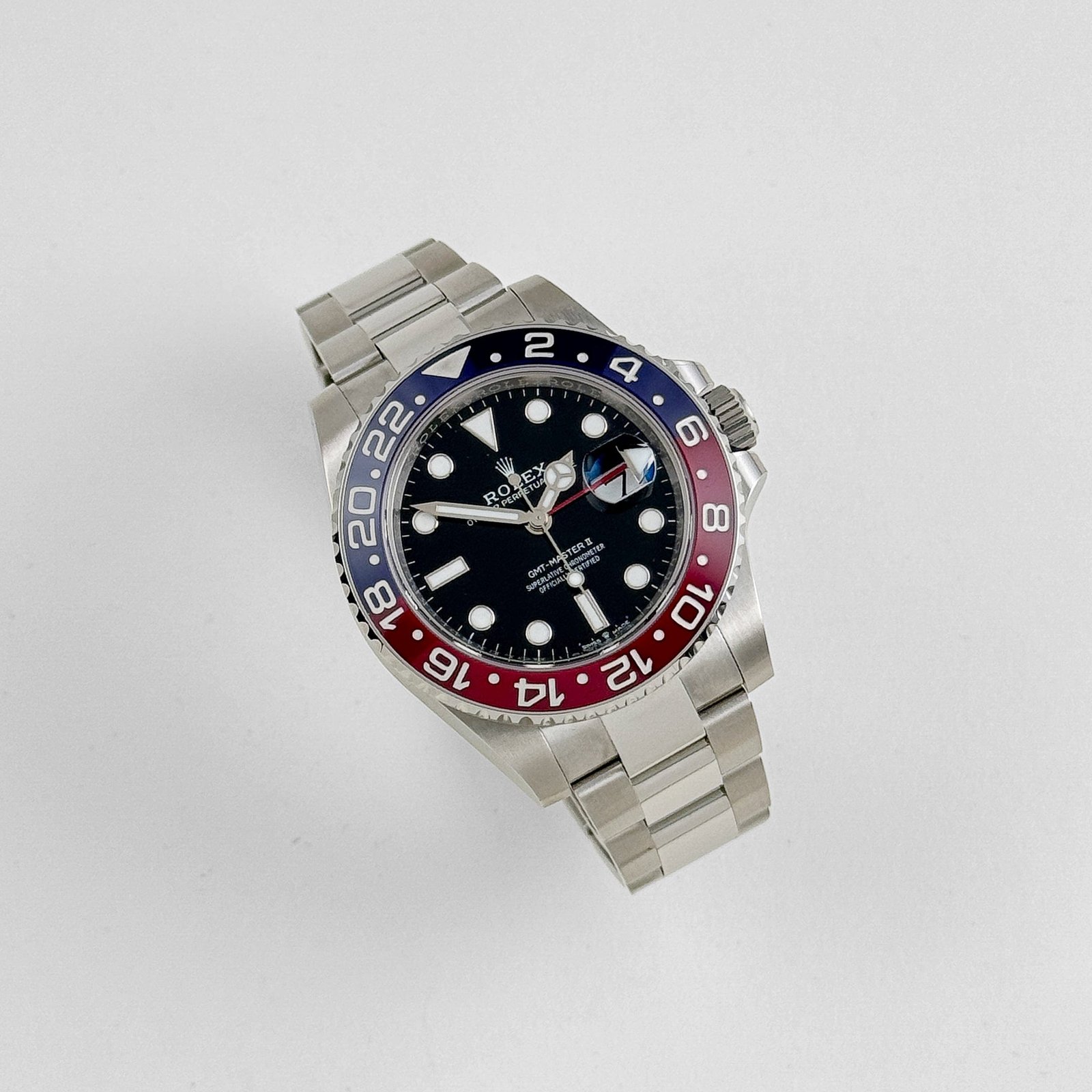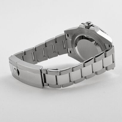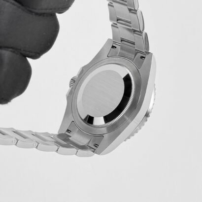 The black dial offers a timeless contrast, featuring luminous Chromalight hour markers and Mercedes-style handsfor optimal readability in all conditions. A red GMT hand works in conjunction with the bidirectional rotating bezel, providing seamless dual-time functionality. The Cyclops lens magnifies the date window at 3 o’clock, ensuring enhanced legibility—one of Rolex’s most iconic design features.