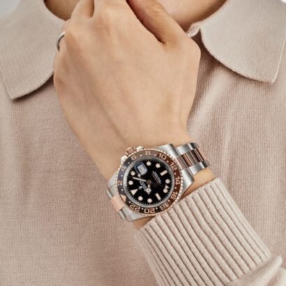 The watch is paired with a Rolesor Oyster bracelet, featuring polished Everose gold center links flanked by brushed stainless steel outer links. The Oysterlock clasp ensures secure wear, while the Easylink extension system adds up to 5mm of adjustment for optimal comfort. This blend of materials and functionality underscores the GMT-Master II’s versatility, making it suitable for both business and leisure.