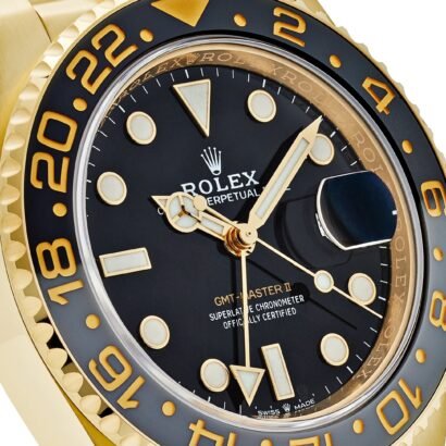The Rolex GMT-Master II exudes timeless elegance and exceptional functionality, making it the epitome of luxury horology. Crafted in a 40mm diameter yellow gold case, this exquisite timepiece boasts a striking black dial and a two-color Cerachrom bezel insert in grey and black ceramic.