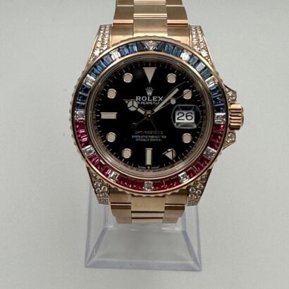 The Rolex GMT-Master II 126755SARU, nicknamed the ‘SARU,’ is a mesmerizing fusion of technical innovation and unparalleled luxury. Crafted from 18k Everose gold, this 40mm masterpiece stands out with its breathtaking bezel, meticulously set with sapphires, rubies, and diamonds in a gradient arrangement, reflecting Rolex’s extraordinary gem-setting expertise.