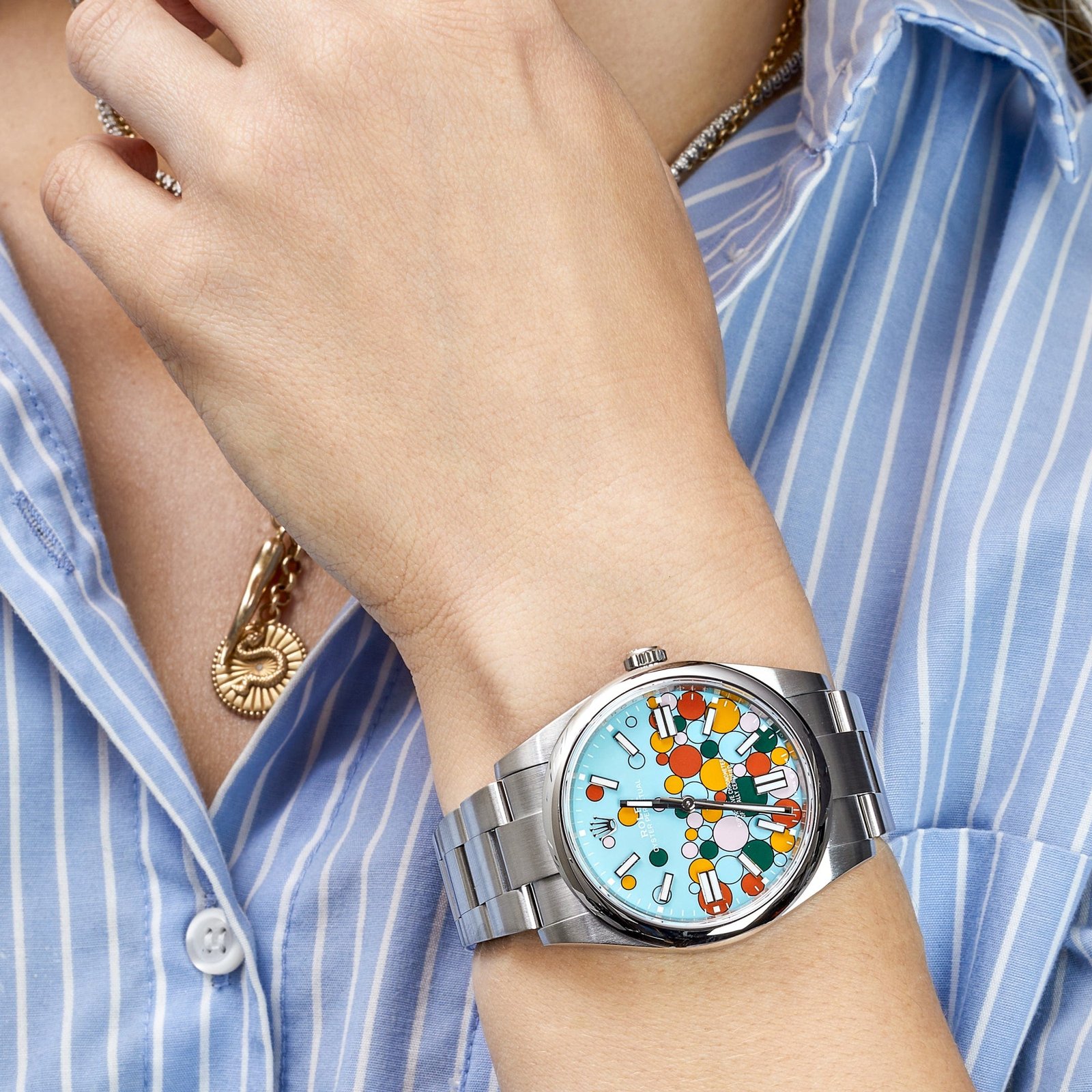 The highlight of this model is the ‘Celebration Motif’ dial, a bold and artistic composition of multicolored bubbles, inspired by Rolex’s vibrant lacquered dials. Featuring shades of turquoise, coral, green, and yellow, the playful design captures the spirit of individuality while maintaining the understated elegance that defines the Oyster Perpetual collection. The baton hour markers and Chromalight-filled hands ensure exceptional legibility, adding practicality to this visually captivating timepiece.