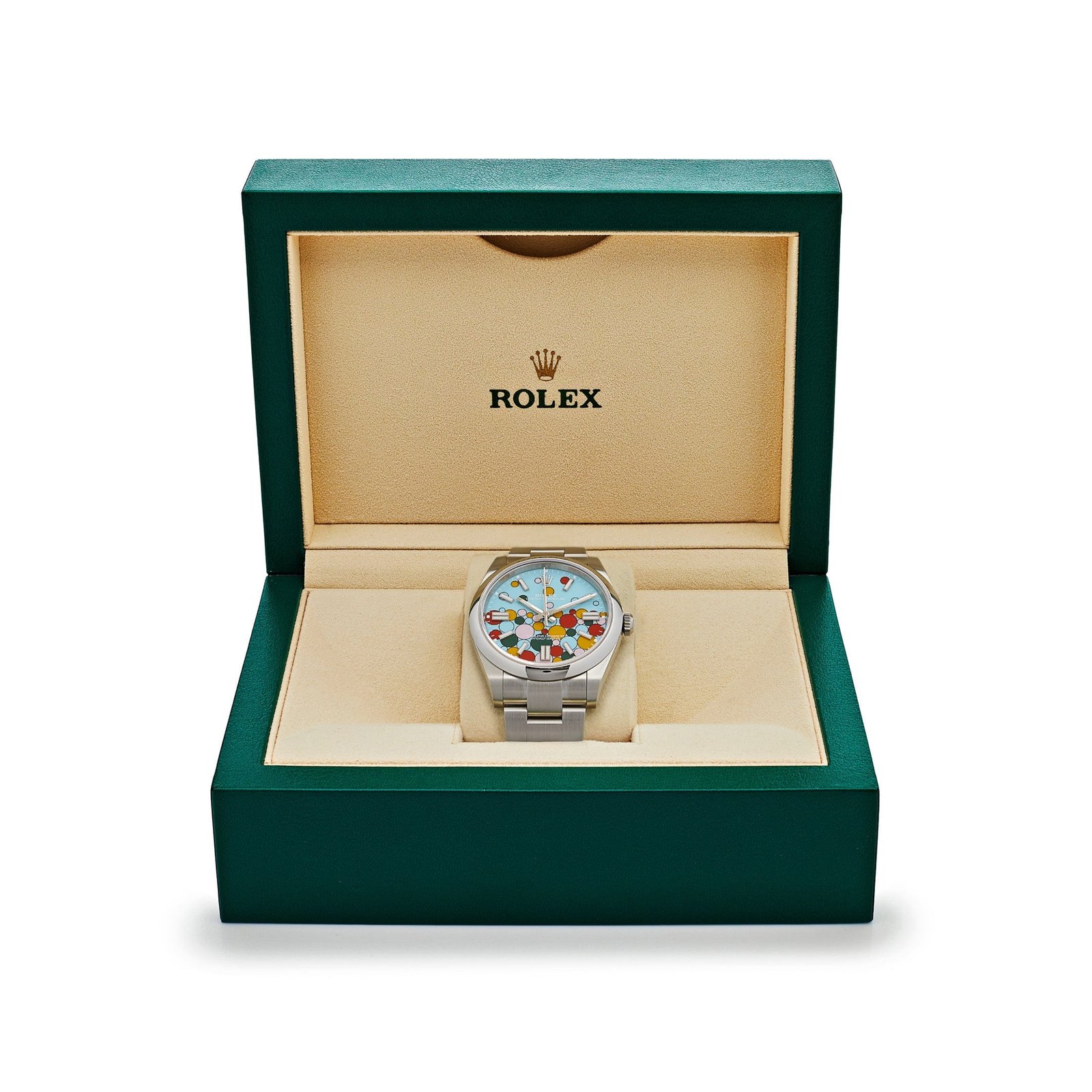 The Rolex Oyster Perpetual 126000 ‘Celebration Motif’ Dial is a lively reimagining of Rolex’s timeless Oyster Perpetual collection, seamlessly blending playful creativity with the brand’s hallmark precision and craftsmanship. Crafted from 904L Oystersteel, Rolex’s proprietary stainless steel alloy, the 36mm case is engineered for exceptional durability and corrosion resistance. Its sleek smooth bezel and polished surfaces enhance the watch’s modern and versatile aesthetic, making it ideal for both casual and formal settings.