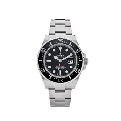 The black dial maintains Rolex’s tradition of legibility and functionality, featuring Chromalight-filled hour markers and hands that glow intensely in low-light environments. A standout feature is the red “Sea-Dweller” text, a nostalgic nod to the vintage models of the 1960s, making it a must-have for enthusiasts of Rolex’s rich dive watch history. The date window at 3 o’clock, magnified by the Cyclops lens, adds practical utility to its design.