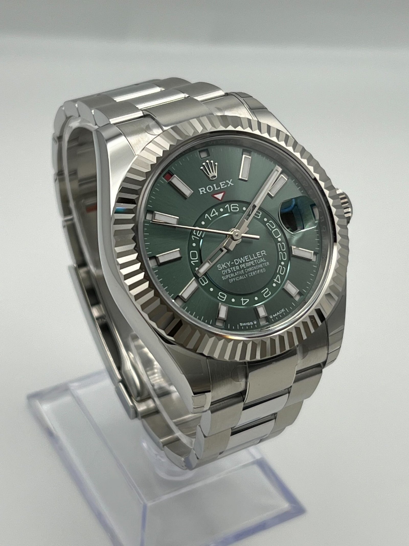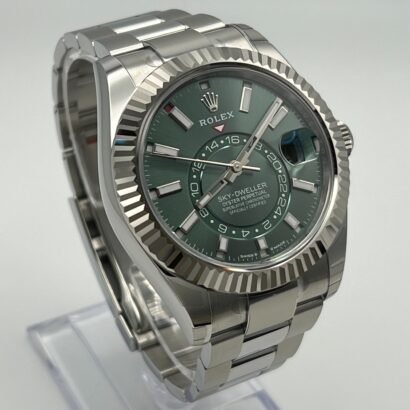 The Rolex Sky-Dweller 336934 is a masterpiece of innovation and sophistication, designed for global travelers who value both function and style. Its 42mm stainless steel Oyster case, paired with the signature white gold fluted bezel, strikes a balance between durability and elegance. The bezel doubles as the intuitive Ring Command system, allowing seamless adjustment of the watch’s dual time zone and annual calendar functions.