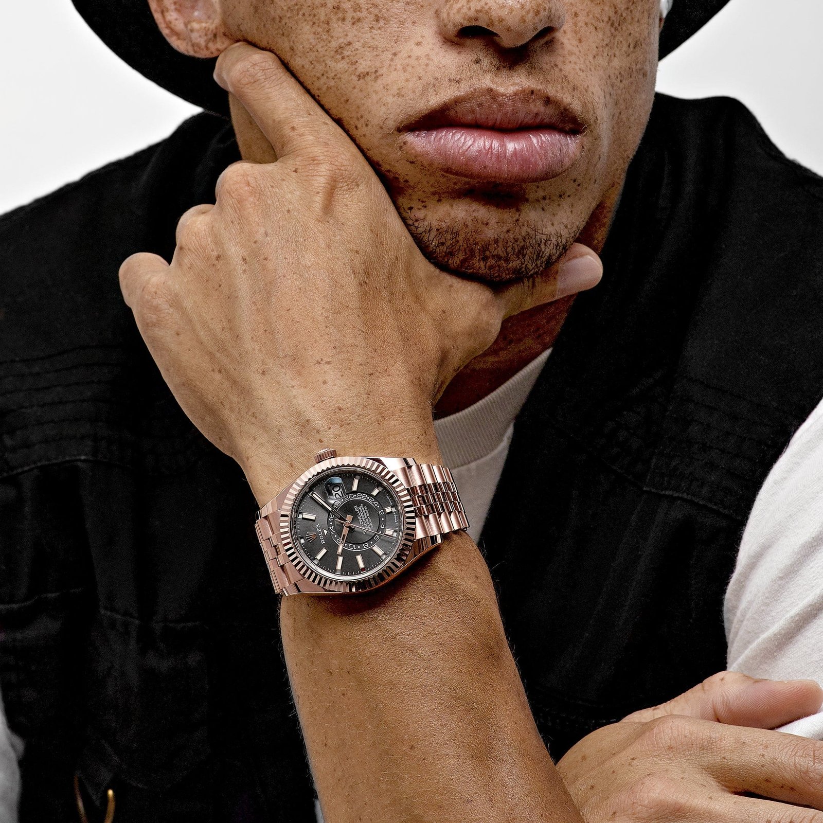 The Everose gold Jubilee bracelet, with its five-piece link construction, combines unmatched luxury with exceptional comfort. Its concealed Crownclasp ensures a seamless, elegant fit, while the bracelet’s ergonomic design enhances wearability throughout the day.