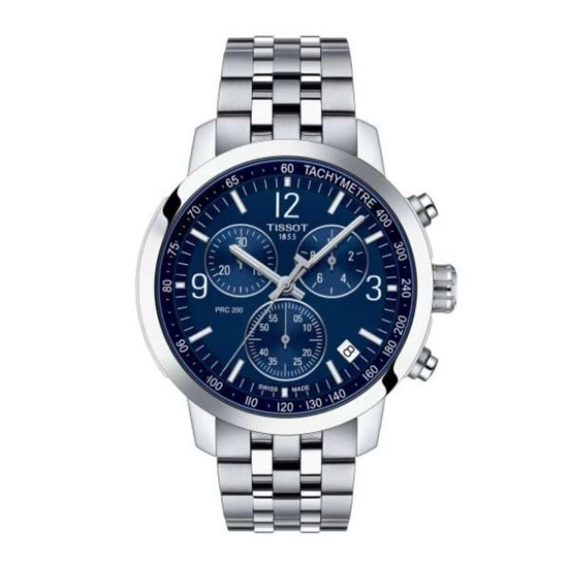The Tissot PRC 200 wristwatch is a refined blend of sporty durability and elegant Swiss craftsmanship. Featuring a 42 mm polished stainless steel case with a fixed silver bezel, this timepiece showcases a striking blue dial with Arabic numerals and baton indexes, enhanced by luminous hands and markers for visibility in low light. Powered by a precise Swiss quartz movement, it offers chronograph functionality, a date indicator, and superior water resistance up to 200 meters. The stainless steel bracelet with a fold-over push-button deployant ensures secure comfort, making it an ideal choice for both luxury and sport. Complete with original packaging and manual, this model embodies timeless performance.