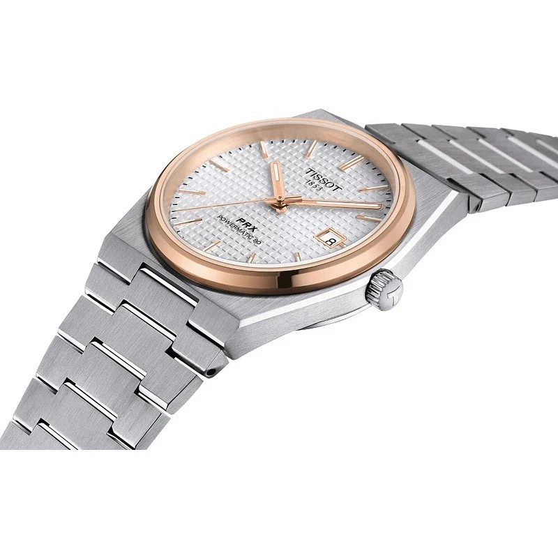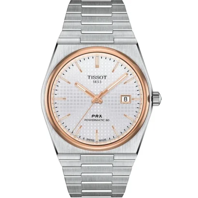 The Tissot PRX Powermatic 80 (T1374072103100) blends timeless elegance with modern innovation, offering a perfect balance of style and precision. This 40mm men’s automatic watch features a sleek silver dial, complemented by a rose gold PVD–coated bezel and case accents, giving it a sophisticated two-tone appearance. The integrated stainless-steel bracelet enhances comfort and offers a distinctive 1970s-inspired silhouette—the signature PRX look.