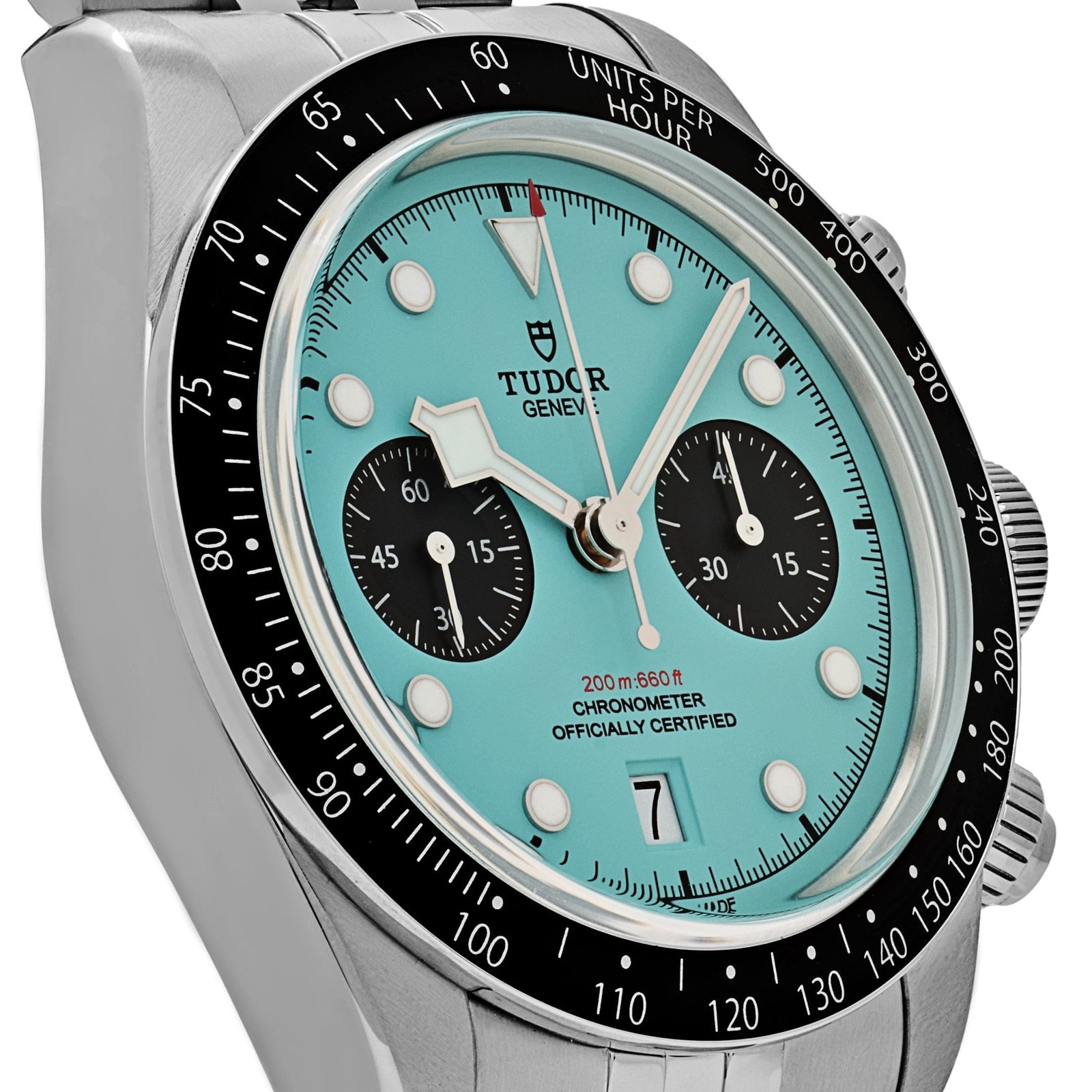 The Tudor Black Bay Chrono 79360N-0024 is a bold and contemporary take on the brand’s iconic chronograph, featuring a striking turquoise dial that adds a vibrant, modern touch to its vintage-inspired design. The 41mm stainless steel case is meticulously finished with a combination of polished and satin-brushed surfaces, maintaining the rugged yet refined aesthetic that defines the Black Bay collection. The black anodized aluminum tachymeter bezel provides a sharp contrast to the bright dial, reinforcing its motorsport and diving heritage.