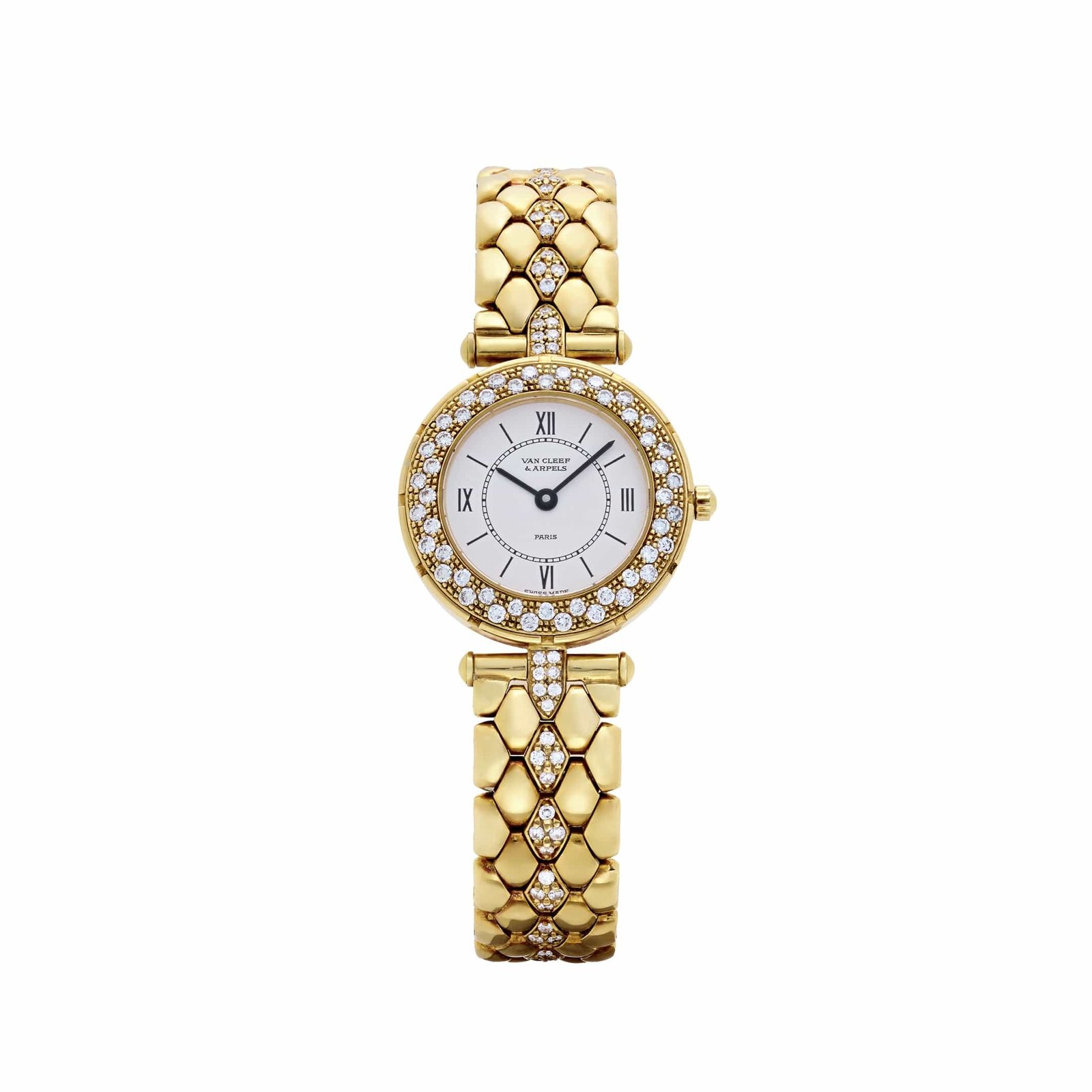 What sets this piece apart is the distinctive diamond setting on the bracelet: a vertical line of brilliant-cut diamonds runs straight down the center links, drawing the eye and creating a visual continuity between the case and the strap. This jewelry-forward design reflects Van Cleef & Arpels’ signature style—more than just a watch, it’s an expression of timeless elegance and refined luxury. Ideal for collectors of haute joaillerie timepieces, the 13607B2 represents the Maison’s delicate balance of sophistication, simplicity, and sparkle.