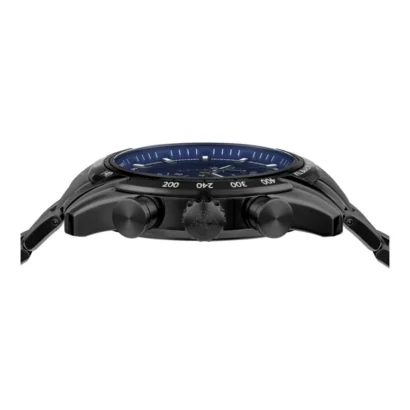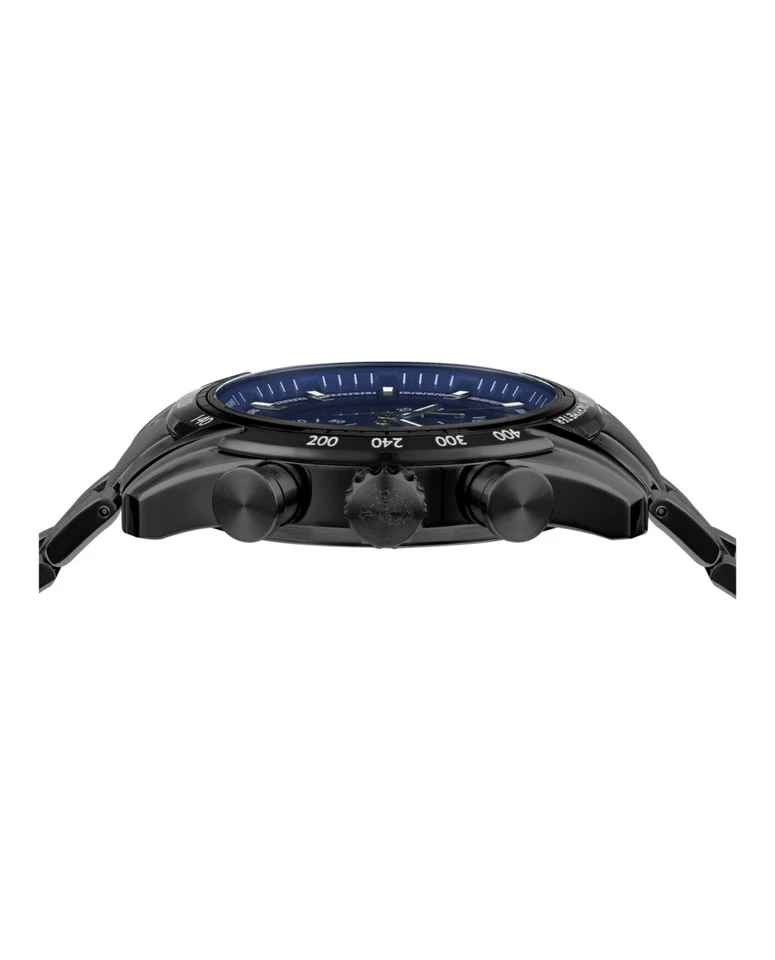 The **Versace V-Ray VE2I00521** is a luxury men’s wristwatch that embodies elegance, precision, and modern sophistication. With a **44 mm polished stainless steel case** in sleek black and a matching **black stainless steel bracelet**, this timepiece makes a bold statement. Its **fixed black bezel** surrounds a deep **blue dial**, detailed with **baton indexes**, luminous hands, a **seconds hand**, and a **date indicator**, ensuring both functionality and style.