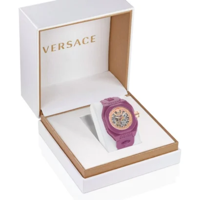 The Versace V-Legend Skeleton (Ref. VE7L00323-BURG-OS) is a bold men’s timepiece that showcases luxury craftsmanship with modern design. Featuring a striking gold skeleton dial framed by a burgundy bezel and case, it highlights the precision of its Swiss-made 3-hand automatic movement. The cushion-shaped 42mm case pairs elegantly with a purple recycled PU strap and deployant closure, offering both comfort and sustainability. With 50 meters of water resistance, baton indexes, and a case thickness of 13.2mm, this watch balances sophistication and durability.