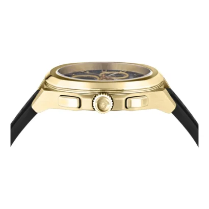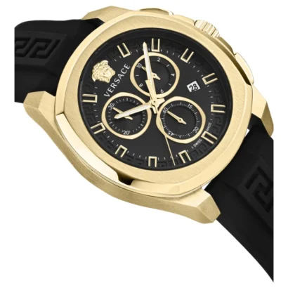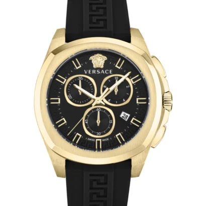 The Versace Geo Chrono VE7CA0423-GOLD1-OS men’s wristwatch is a luxurious and versatile timepiece designed for classic, casual, formal, and sport occasions. Featuring Swiss-made chronograph date quartz movement, a black analog dial with baton indexes, and a durable gold-tone stainless steel case paired with a black silicone one-piece strap, it combines elegance and functionality. With a 43 mm cushion-shaped case, 12 mm thickness, 50-meter water resistance, gold bezel, and buckle closure, this 2023 model comes with original packaging and manual, making it a perfect statement piece for stylish men.