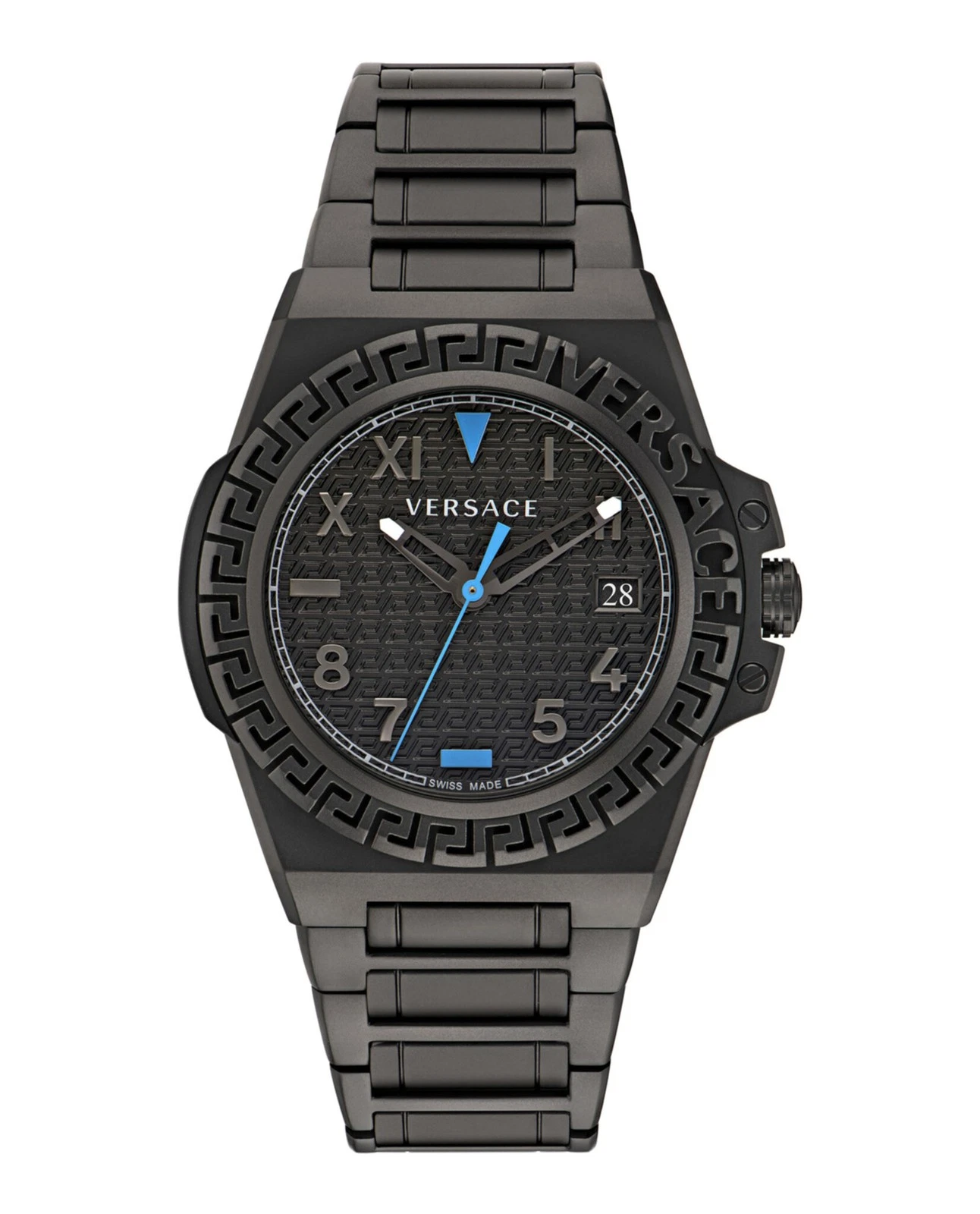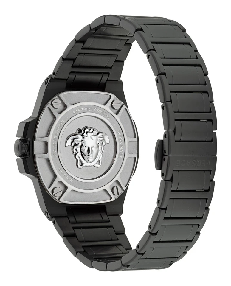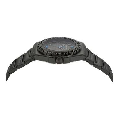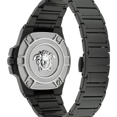 The Versace Mens IP Black 44mm Bracelet Fashion Watch (Ref. VE3I00622) from the Greca Reaction line is a bold, modern statement piece that blends Italian fashion flair with reliable Swiss performance. Its 44 mm round IP black stainless steel case and matching black stainless steel bracelet create a strong, monochrome look that pairs effortlessly with everything from casual streetwear to sharp formal outfits. The black analog dial keeps the design sleek and minimalist while the 3-hand date quartz movement offers accurate, low-maintenance timekeeping. Swiss Made quality underlines its luxury credentials, and with 50 m (5 ATM) water resistance it’s more than capable of handling everyday life. Delivered with original box, papers, manual/booklet and backed by both a 2-year manufacturer warranty and seller warranty, this non-vintage Versace Greca Reaction is an ideal choice for men who want a versatile, all-black fashion watch with genuine prestige on the wrist.
