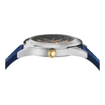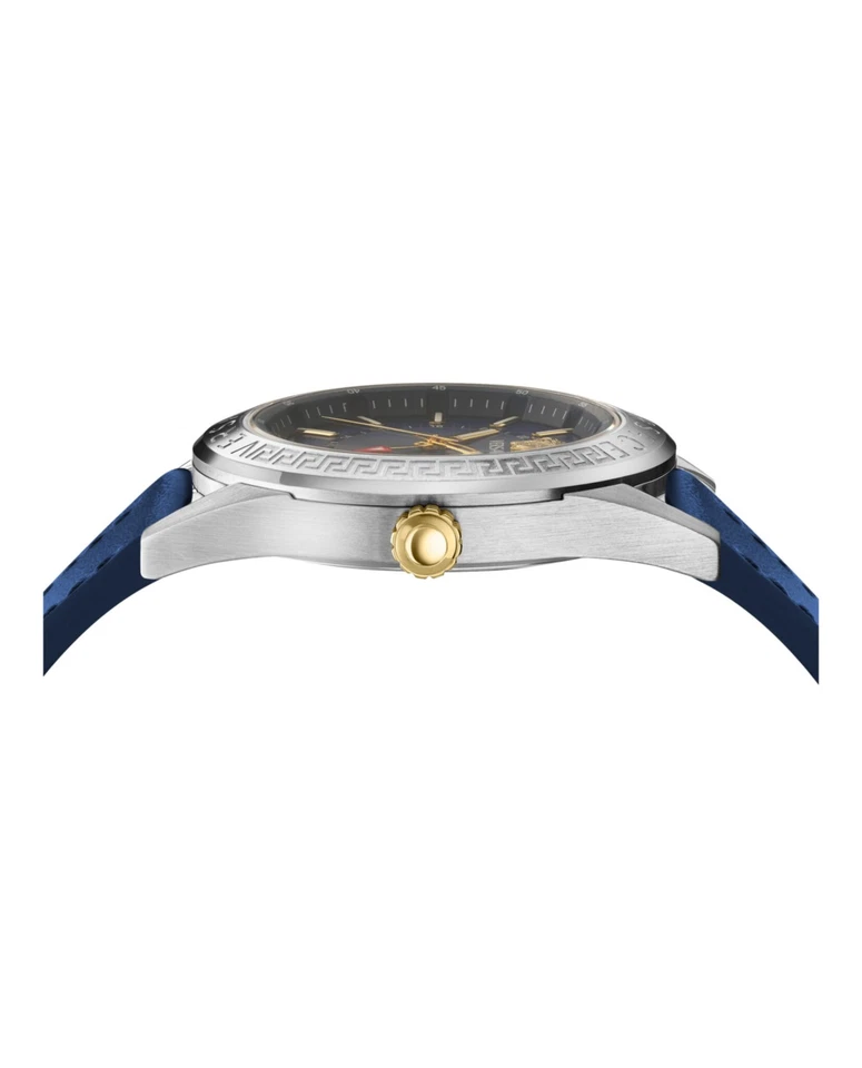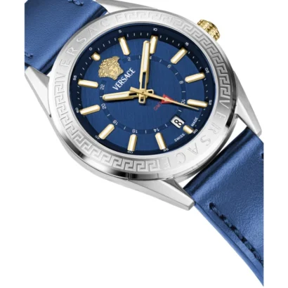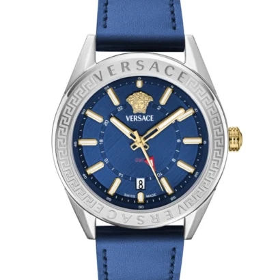 The Versace V-Code (Ref. VEAFA0124-STSTL-OS) is a sophisticated men’s watch that blends modern elegance with Swiss precision. Featuring a 42mm stainless steel round case and a striking blue dial with baton indexes, it is powered by a reliable GMT quartz movement, perfect for those who travel across time zones. The watch is paired with a sleek blue leather strap and secured with a classic buckle closure, complementing its stylish silver bezel and case.