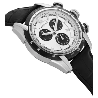 The Versace Men’s Stainless Steel 44mm Strap Fashion Watch (Reference Number: VE2I00821) is an elegant, luxurious timepiece with a chronograph date quartz movement and a silver dial that exudes sophistication. The 44mm round stainless steel case is complemented by a classic black leather strap, offering both style and comfort. With Swiss craftsmanship, this watch features Swiss made movement and 50m (5 ATM) water resistance, making it practical for everyday wear. The date indicator and chronograph functionality add utility to its timeless design. The watch also comes with original box, papers, and a 2-year manufacturer warranty.