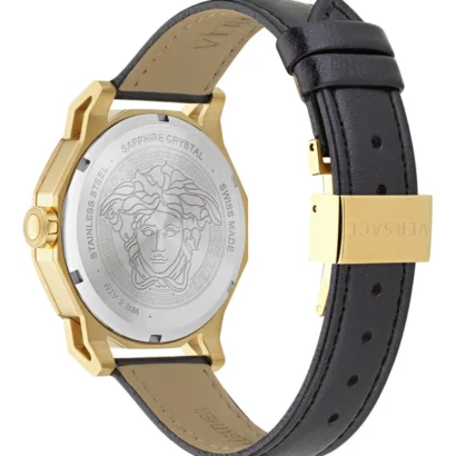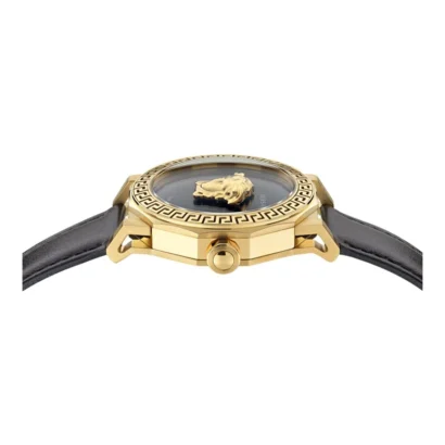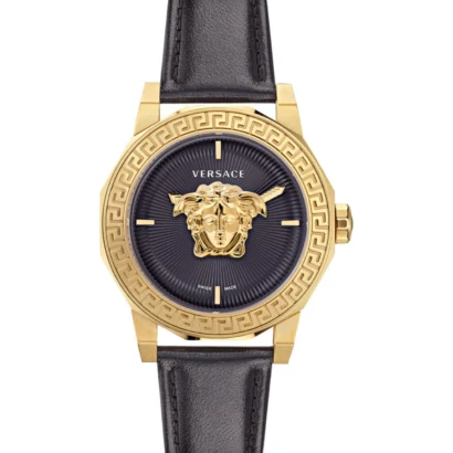 The Versace Medusa Deco VE7B00223-GOLD1-OS is a luxurious women’s wristwatch that exudes elegance and sophistication. Featuring a polished gold stainless steel case with a black dial and baton index markers, this 38 mm round timepiece is paired with a black leather one-piece strap for a refined and comfortable fit. Powered by a precise 2-hand Swiss quartz movement and protected by 50 m (5 ATM) water resistance, it is perfect for classic, casual, formal, luxury, and sporty occasions. Complete with original box, manual, and a 2-year manufacturer warranty, the Versace Medusa Deco combines high-end style with lasting functionality for women who appreciate premium craftsmanship.