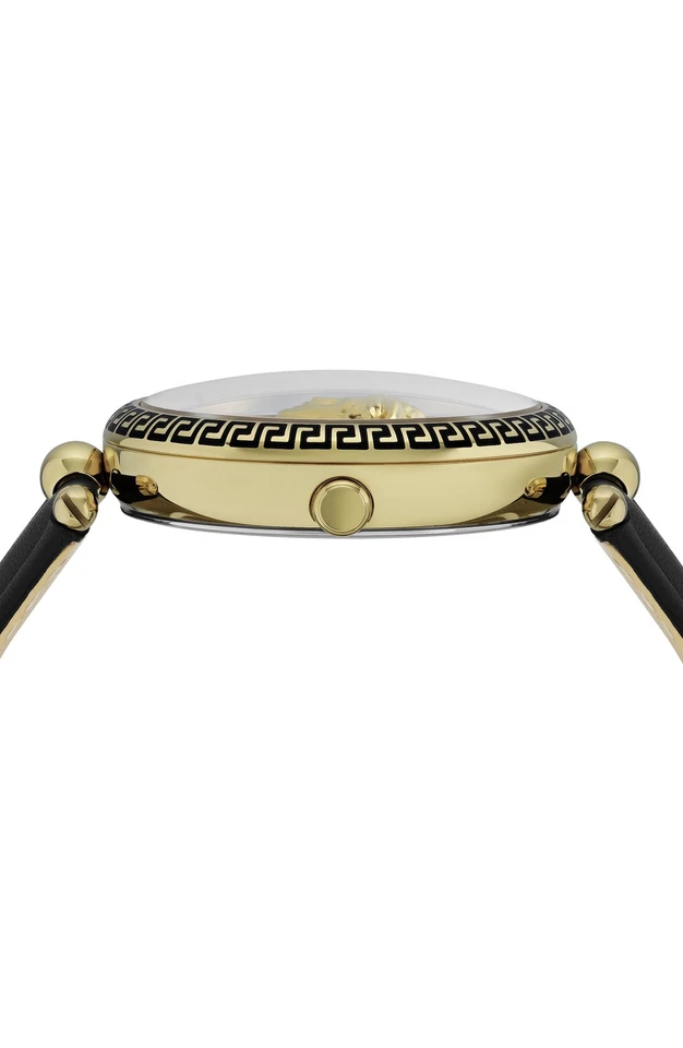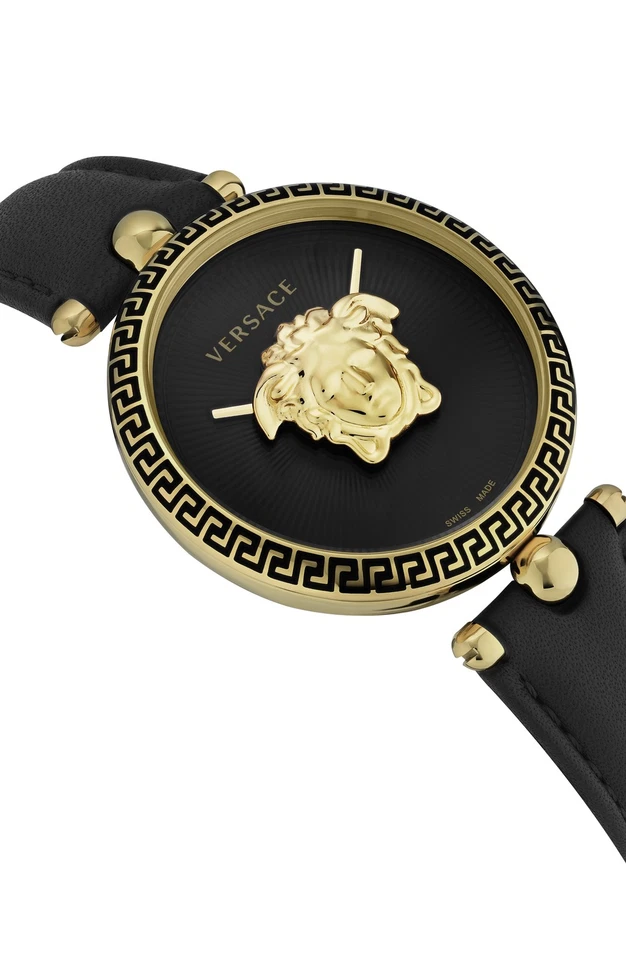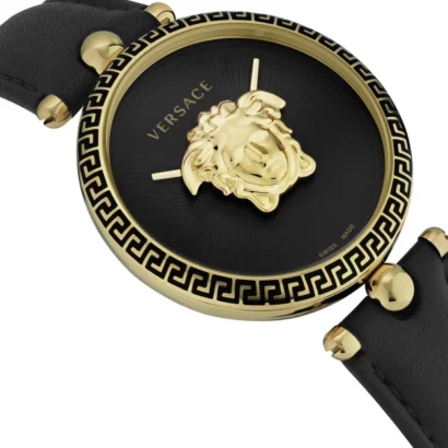 The Versace Palazzo Empire VECO01922 women’s watch embodies timeless elegance and luxury. Crafted in Switzerland with precision Swiss-made quartz movement, it features a striking black dial complemented by a black calfskin leather strap and a gold stainless steel case. The round 39 mm design blends classic, casual, formal, and luxury styles, making it versatile for any occasion. With water resistance up to 30 meters, original packaging, and a 2-year manufacturer’s warranty, this watch is a sophisticated statement piece that combines durability, comfort, and iconic Versace style.