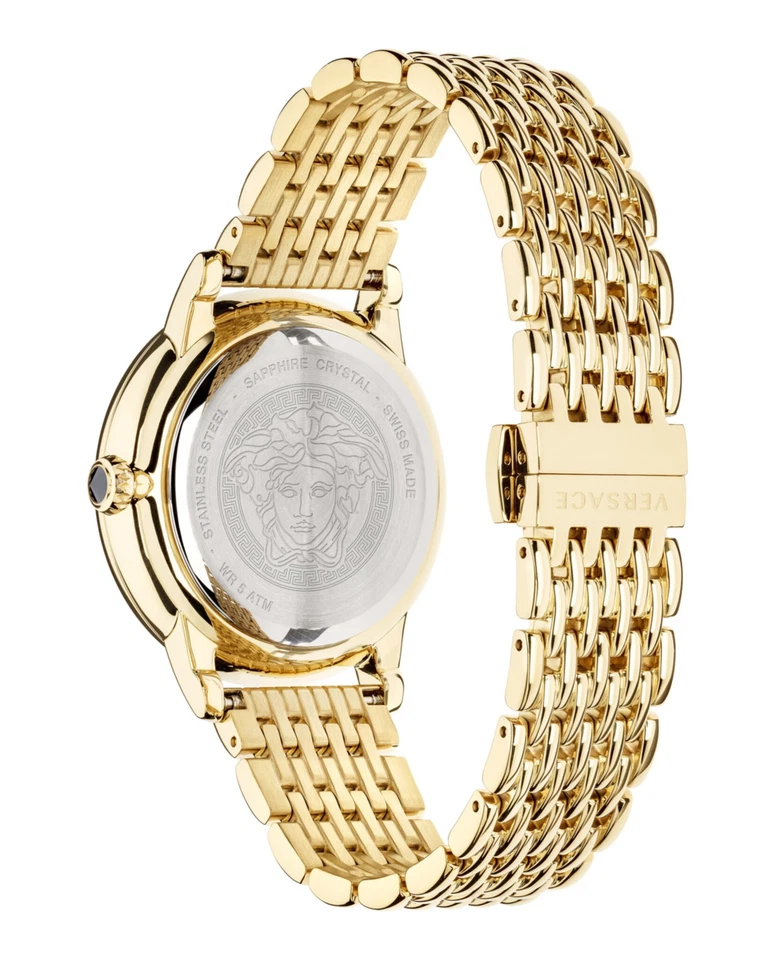 The Versace Medusa Icon VEZ200421 women’s wristwatch radiates luxury and sophistication, perfectly suited for classic, casual, or formal occasions. Crafted from durable stainless steel with a stunning gold finish, this 38 mm round watch features a gold dial with Swiss-made 2-hand quartz movement, ensuring precision and reliability. Its stainless steel bracelet with deployant closure offers comfort and elegance, while 50 meters of water resistance protects it from daily exposure. Complete with original packaging, papers, and a manufacturer warranty, this Versace timepiece blends iconic design, high-quality craftsmanship, and timeless style.