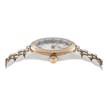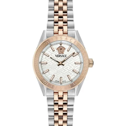 The Versace V-Code VE8I00624 is a refined women’s wristwatch that blends contemporary elegance with Swiss precision. Featuring a 36 mm stainless steel case with a contrasting rose gold bezel, this timepiece exudes sophistication and luxury. Its silver dial with baton indexes ensures a clean and stylish display, complemented by a durable stainless steel bracelet with an 18 mm width for a comfortable fit. Powered by a reliable Swiss-made 2-hand quartz movement, it delivers consistent accuracy while maintaining a slim 8.7 mm profile. With 50 m water resistance, the V-Code is suitable for daily wear and special occasions alike. Perfectly balancing fashion and functionality, this watch is a timeless accessory for the modern woman.